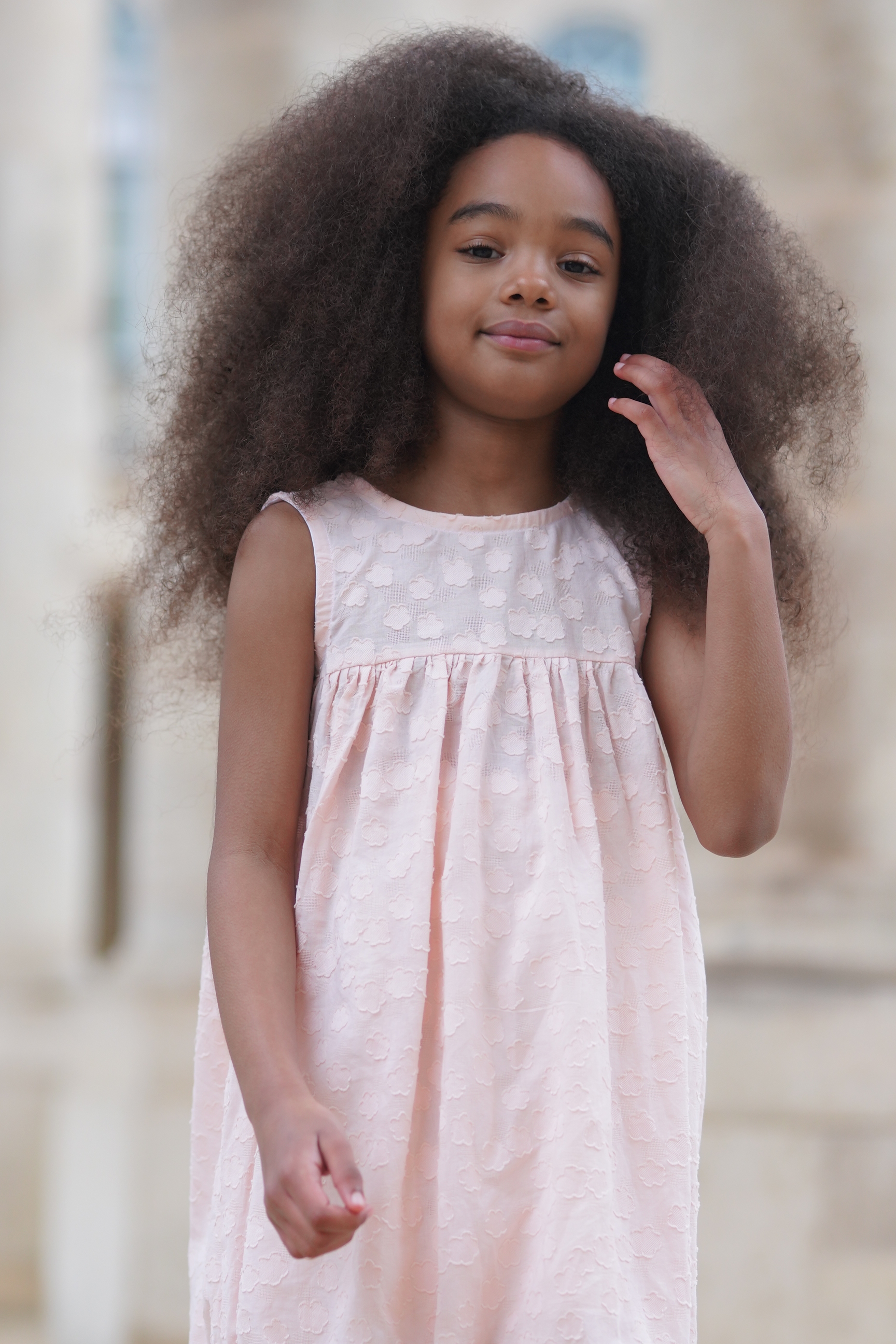 Robe en coton à fleurs brodées rose pâle. Elastique à l'ourlet. Tissus: 100% coton. Made in France.