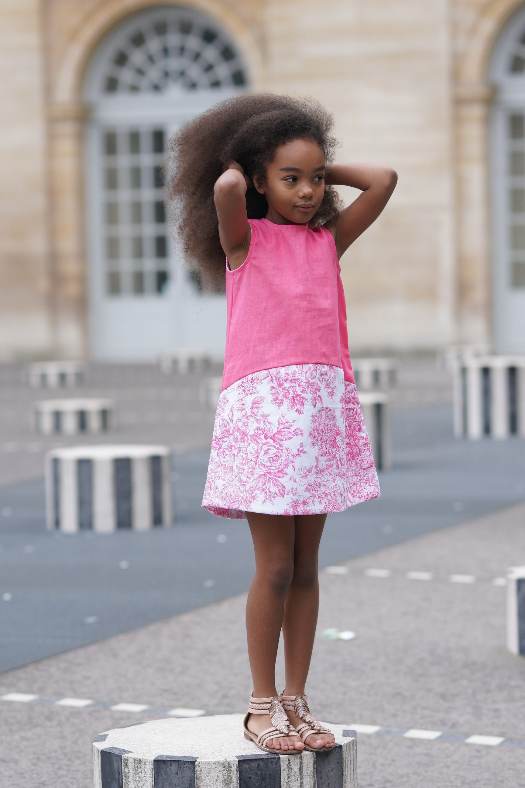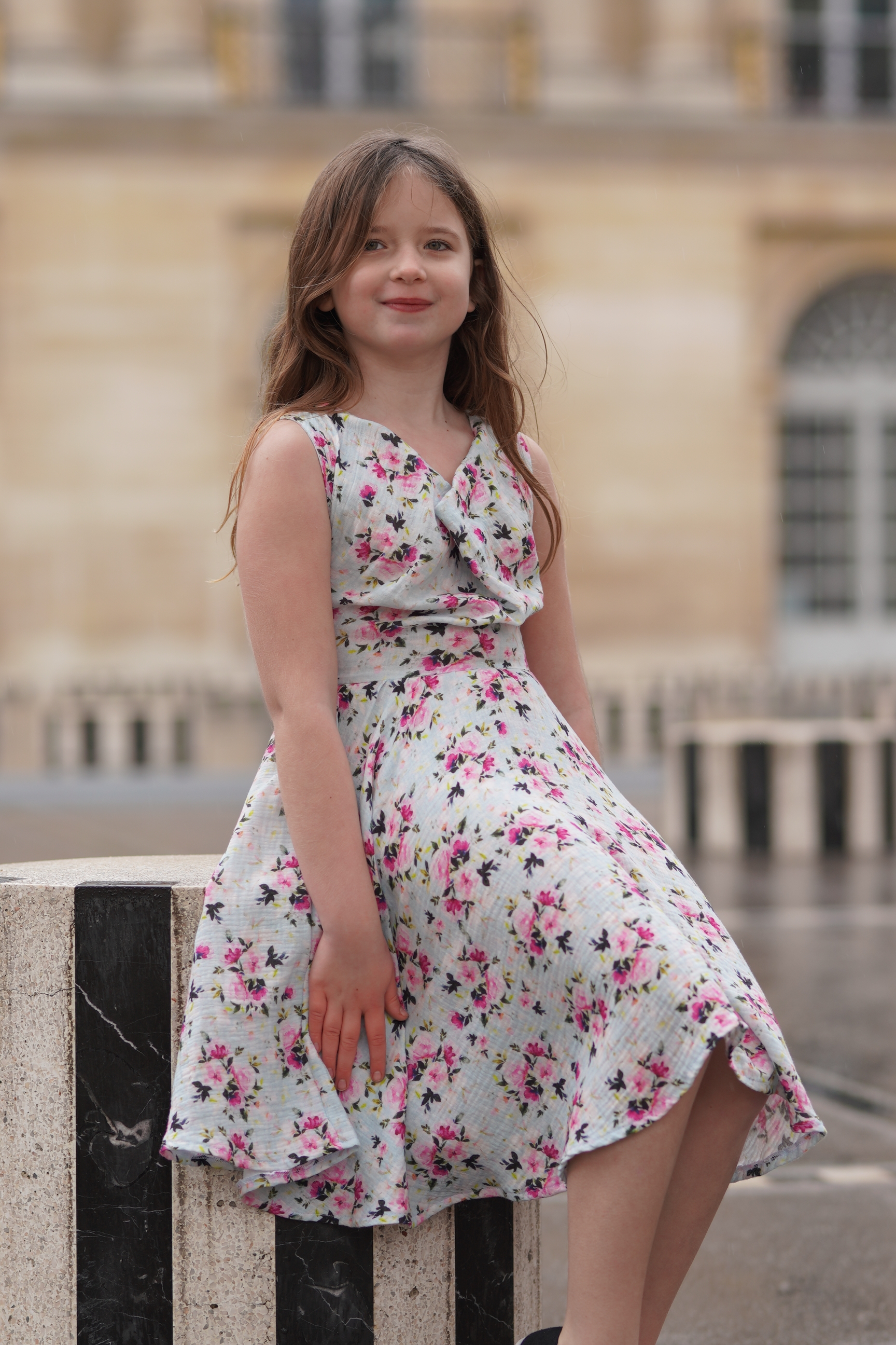 Robe sans manches en coton double gaze à roses. Fermeture à glissière invisible dans le dos. Encolure bénitier. Tissus: 100% coton. Made in France.