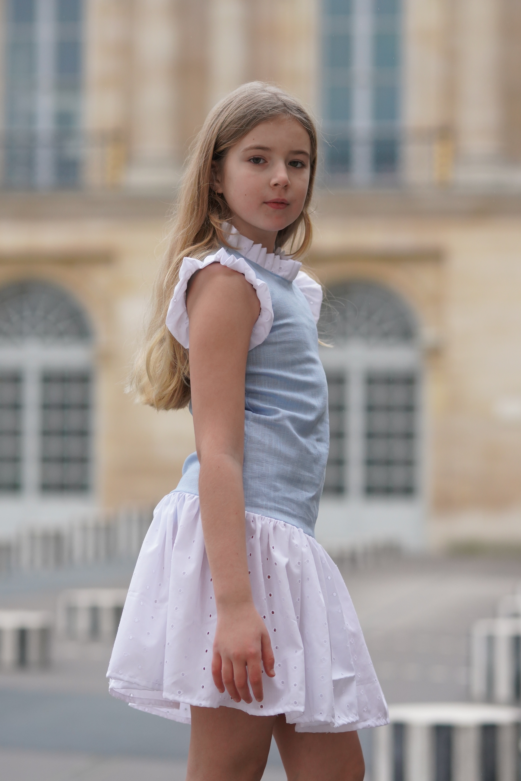 Robe sans manches en lin bleu et broderie anglaise blanche. Galon froncé à l'encolure et aux emmanchures Fermeture à glissière invisible dans le dos. Jupe froncée. Tissus: 100% lin et 100% coton....