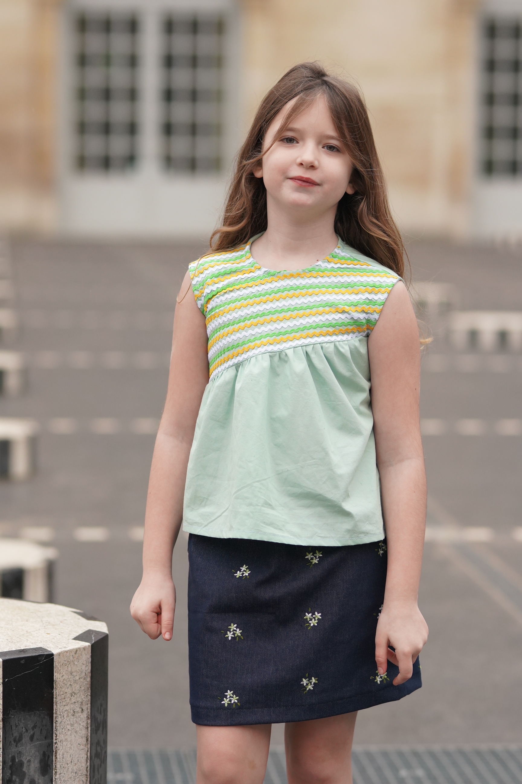 Haut en coton vert pâle et jupe en jean brodé de fleurs. Croquets à l'empiècement. Elastique à la taille. Tissus: 100% coton. Made in France.