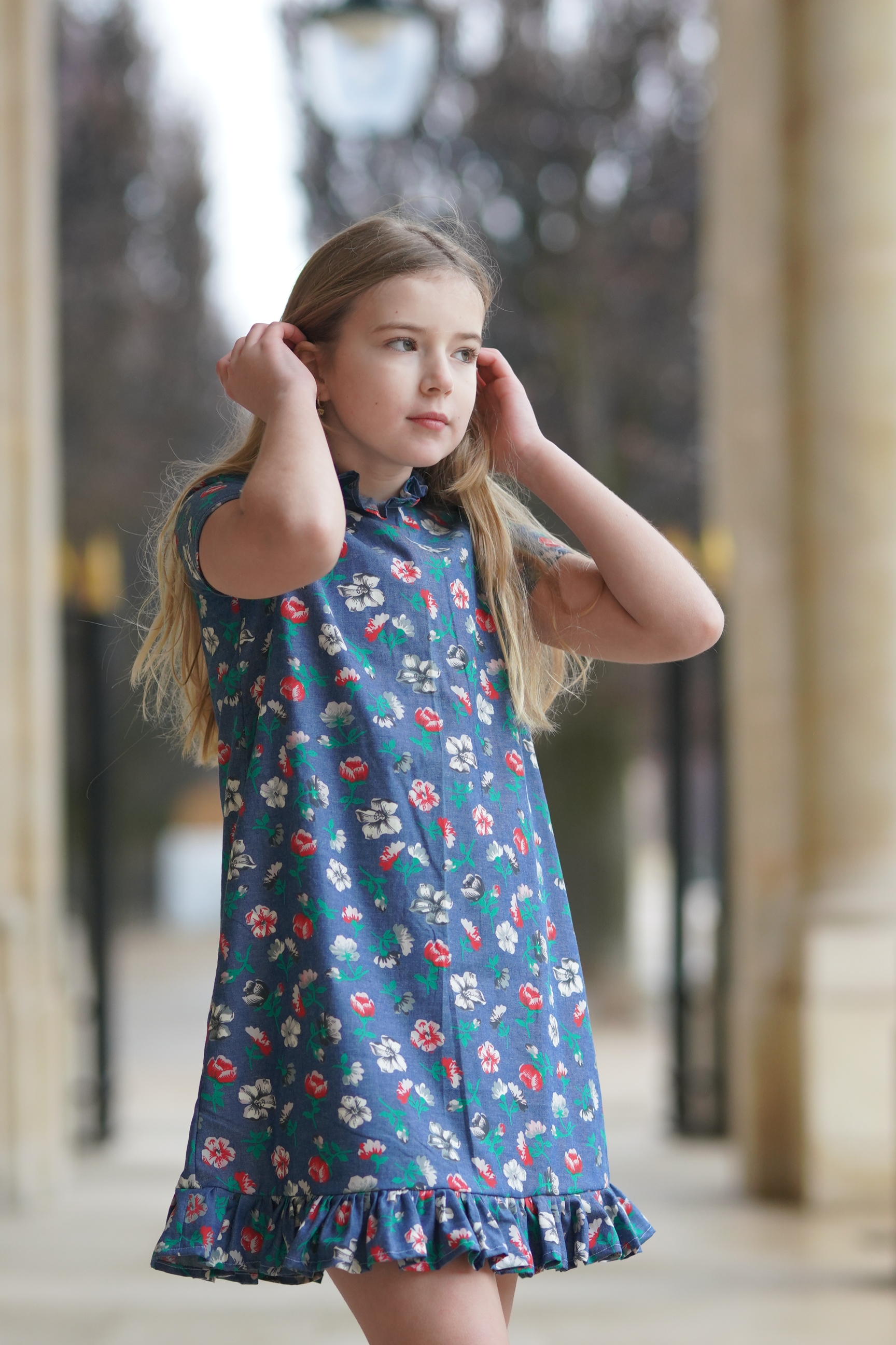 Robe en chambray à fleurs. Manches courtes. Fermeture à glissière invisible dans le dos. Galon plissé à l'ourlet et à l'encolure. Tissus: 100% coton. Made in France.