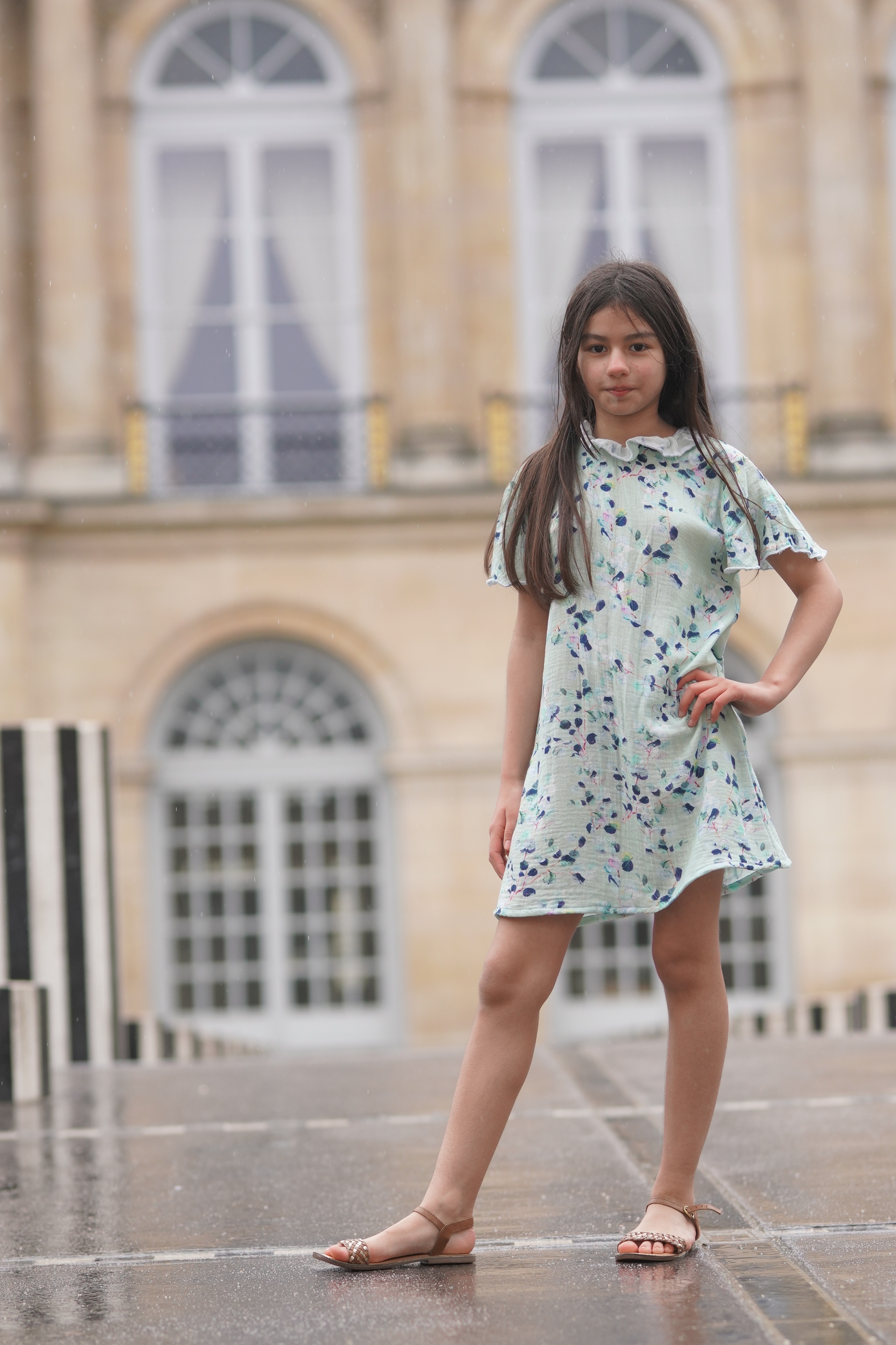 Robe en coton double gaze vert à fleurs. Fermeture à glissière invisible dans le dos. Manches courtes. Tissus: 100% coton. Made in France.