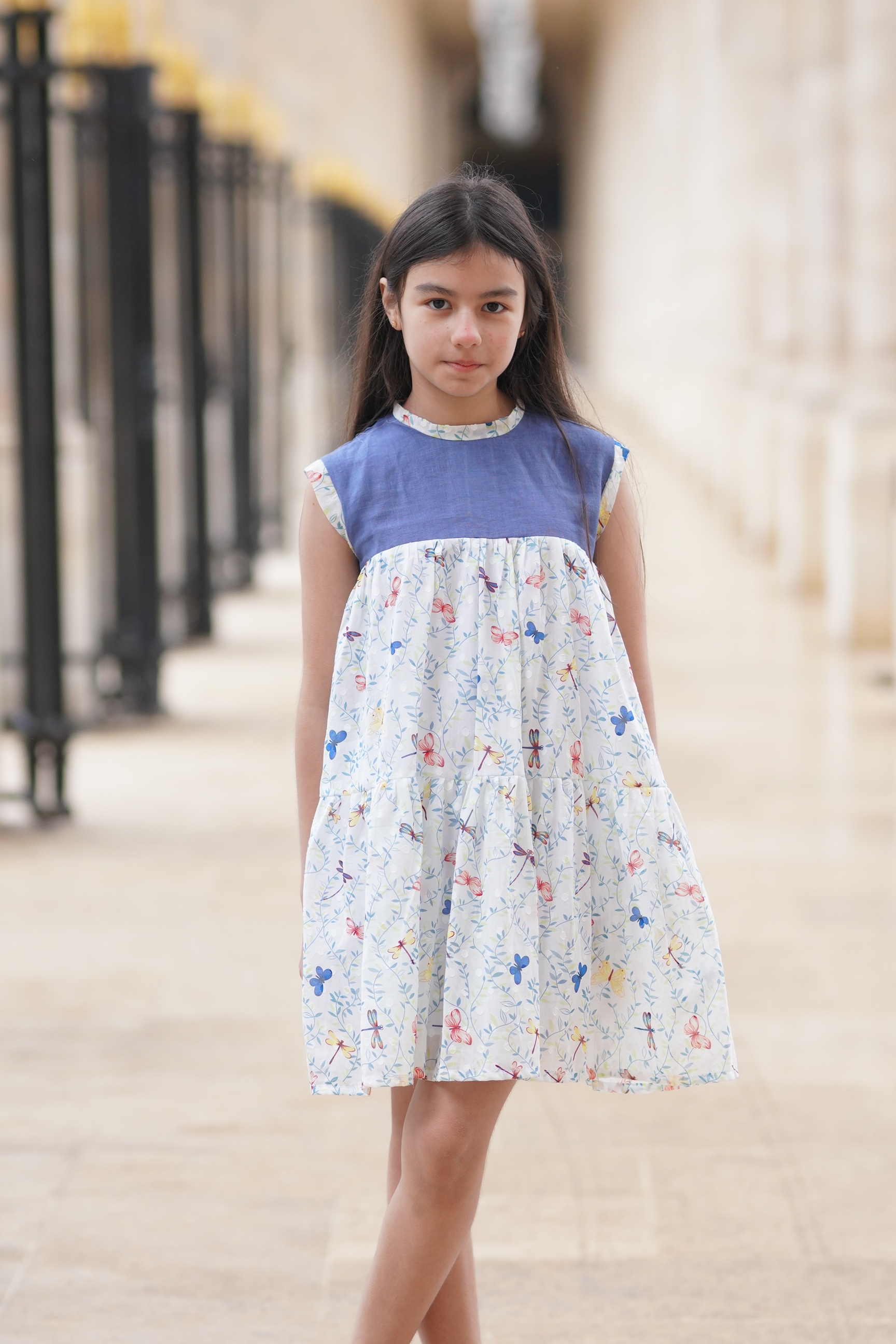 Robe en coton bleu et voile de coton papillons. Empiècement d'encolure bleu. Fermeture à glissière invisible dans le dos. Tissus: 100% coton. Made in France.