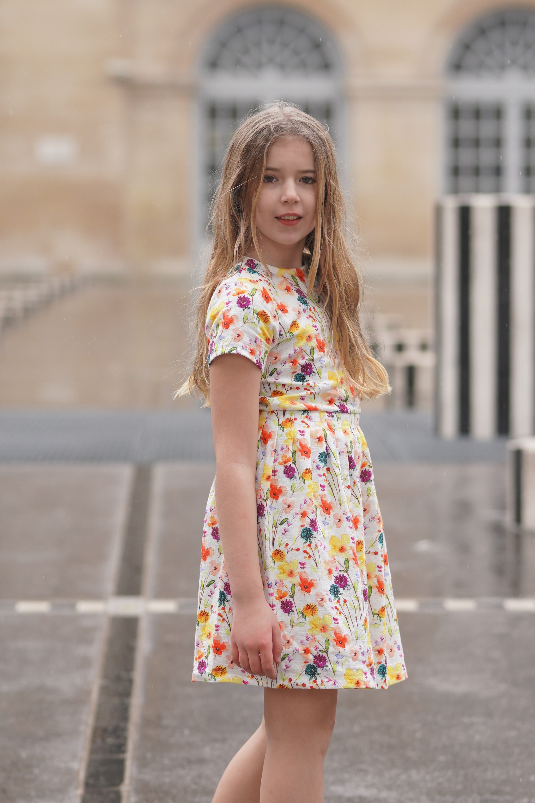 Robe lin fleuri. Jupe plissée Fermeture à glissière invisible dans le dos. Manches courtes. Tissus: 100% lin. Made in France.