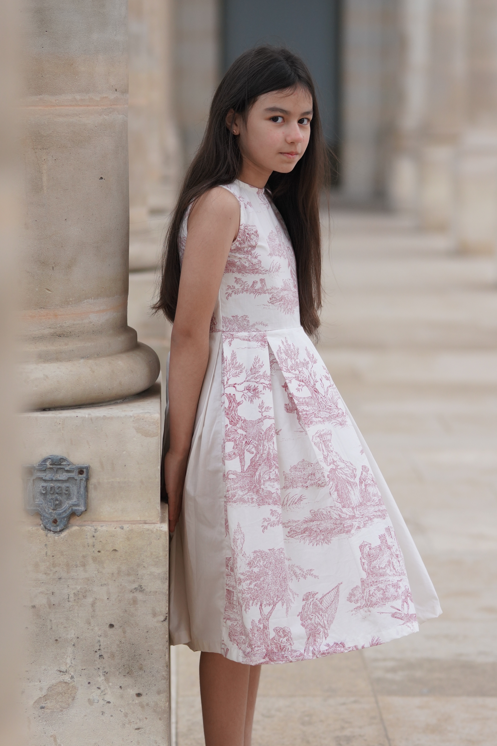 Robe en coton ivoire et toile de Jouy rouge. Jupe à plis creux. Fermeture à glissière invisible dans le dos. Tissus: 100% coton. Made in France.