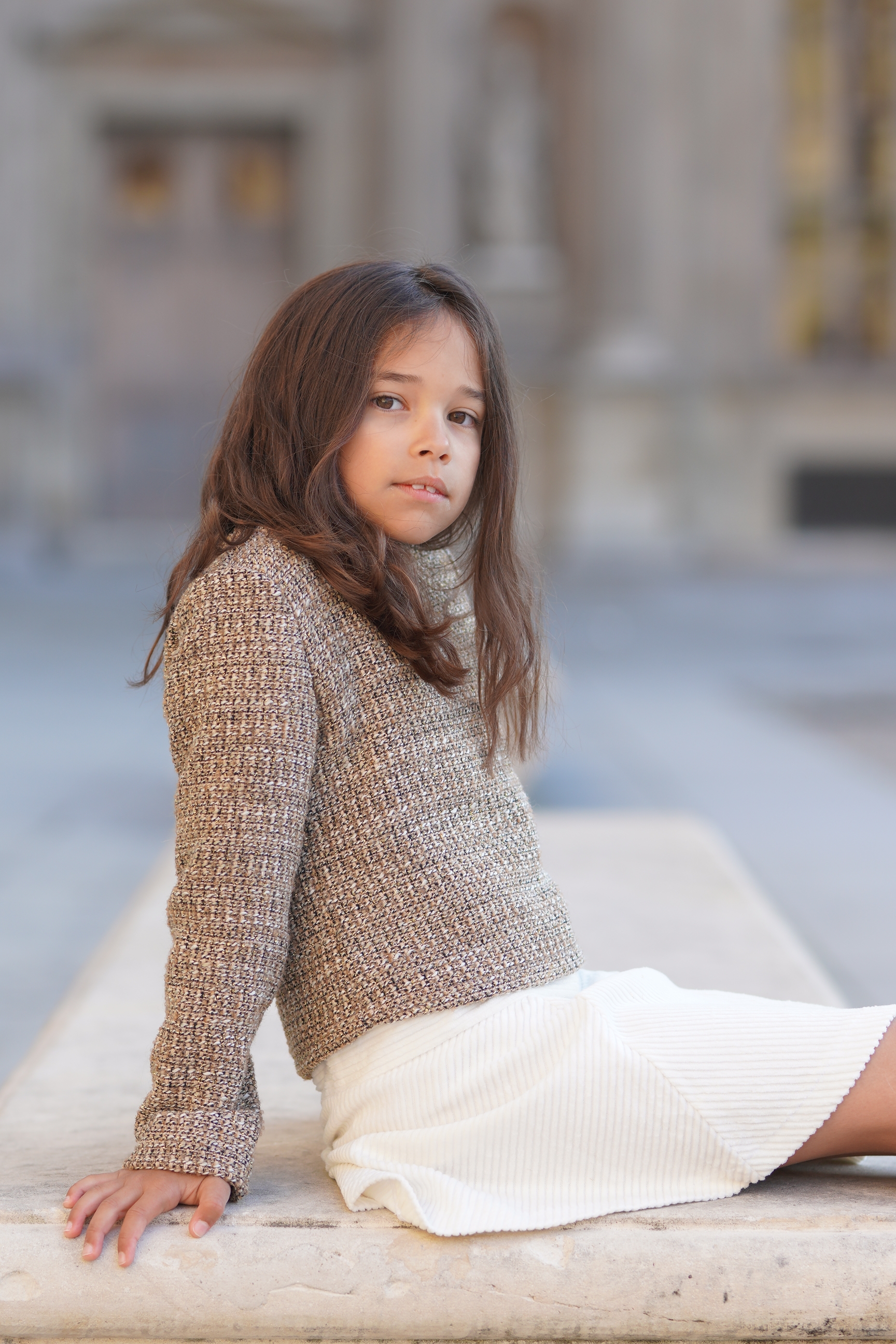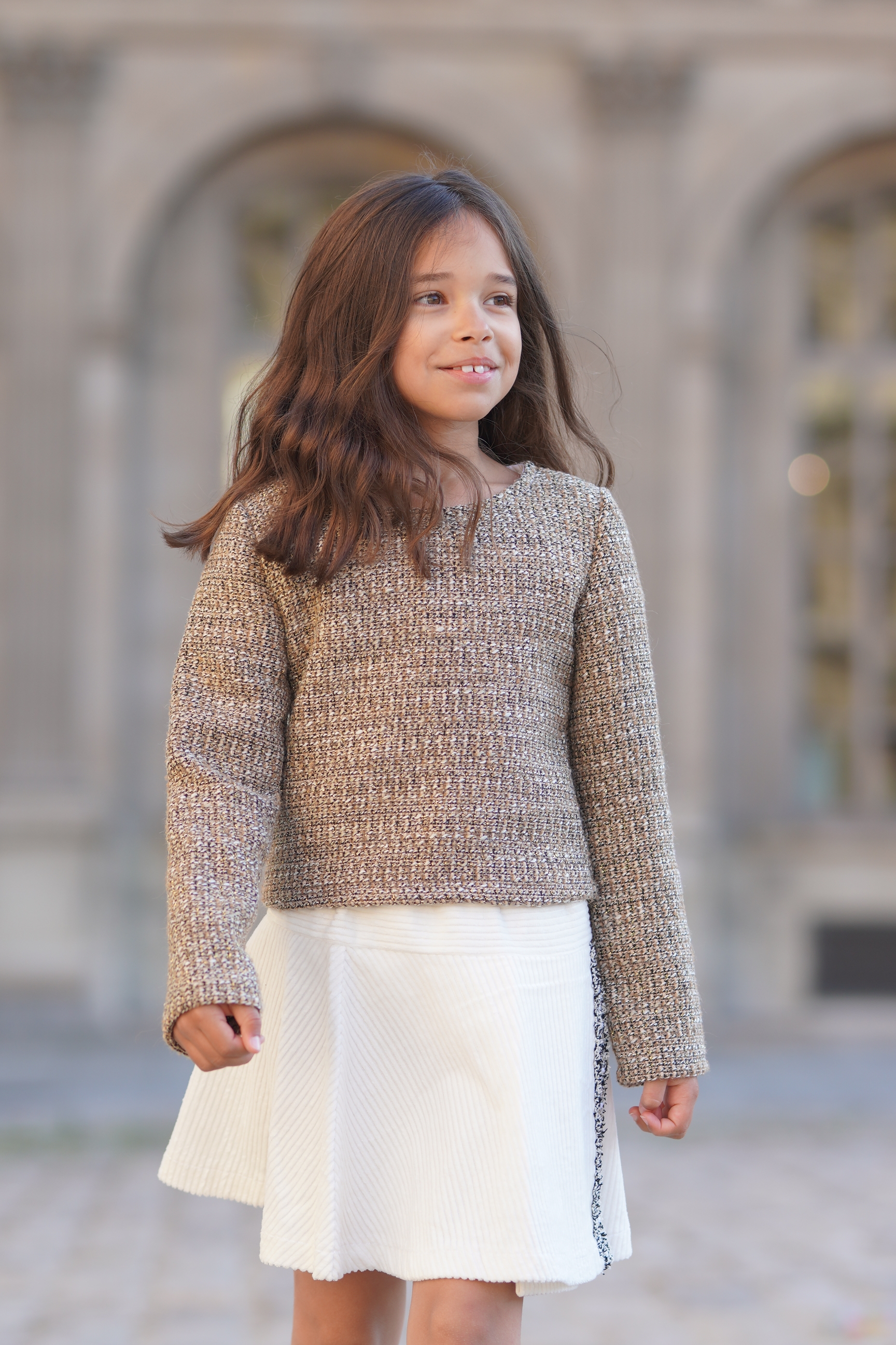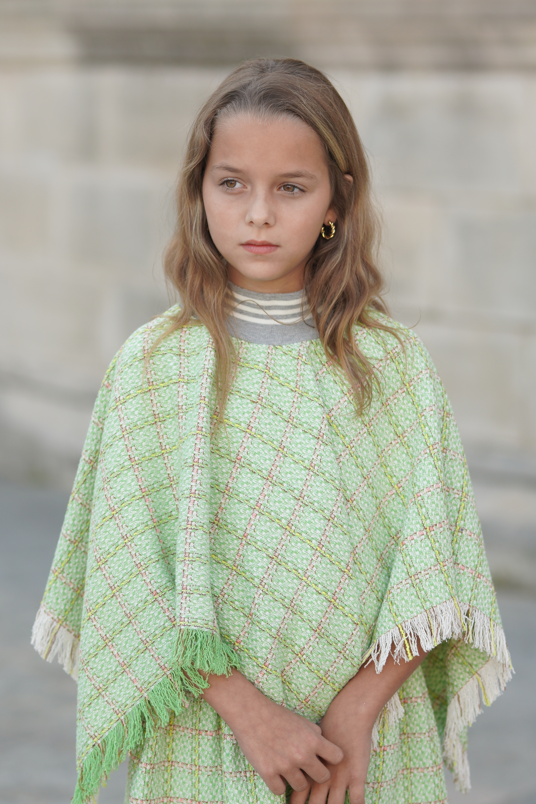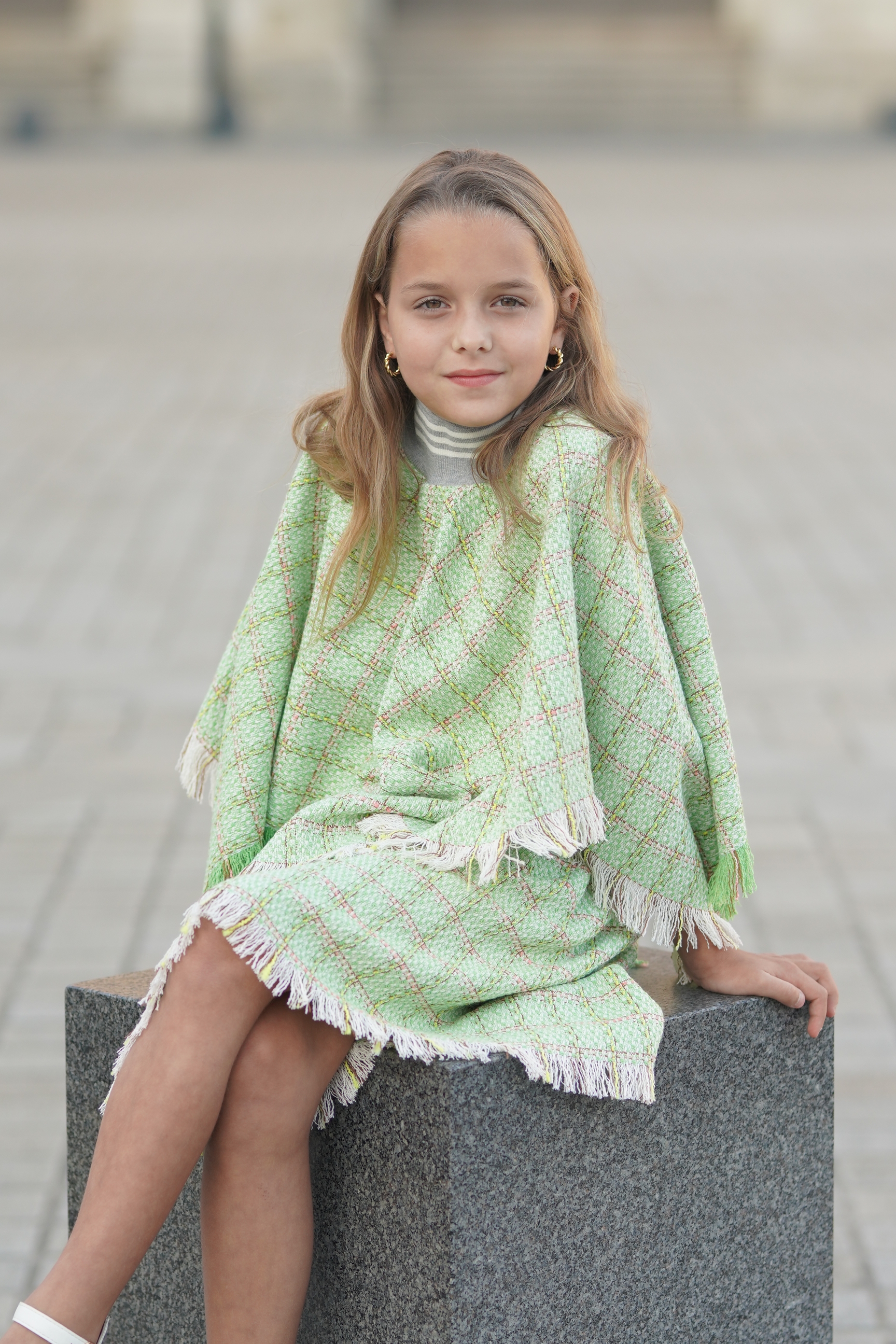 Poncho en Tweed vert et blanc. Col en bord-côte gris et blanc. Jupe assortie avec élastique à la taille Tissus: coton mélangé. Made in France.