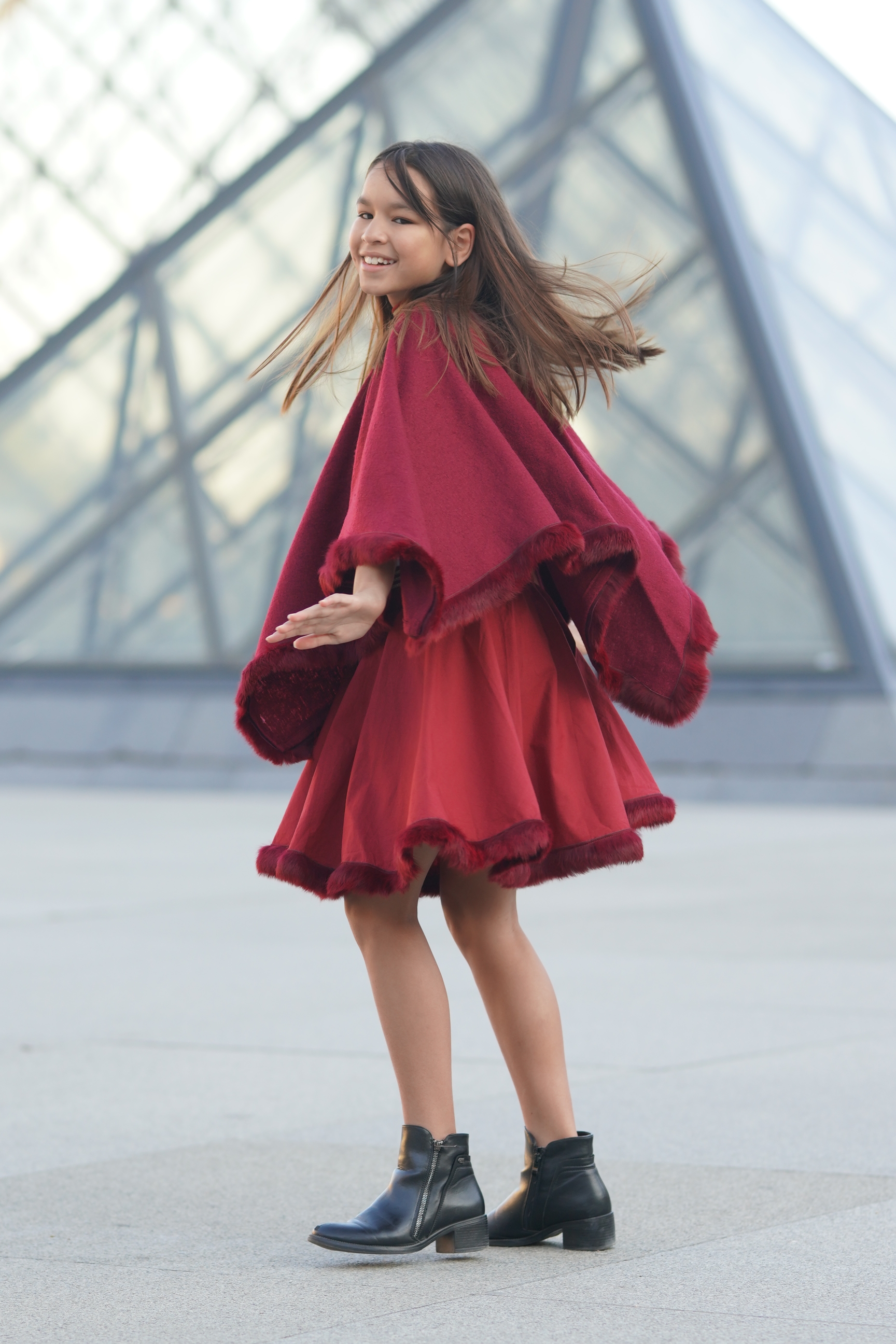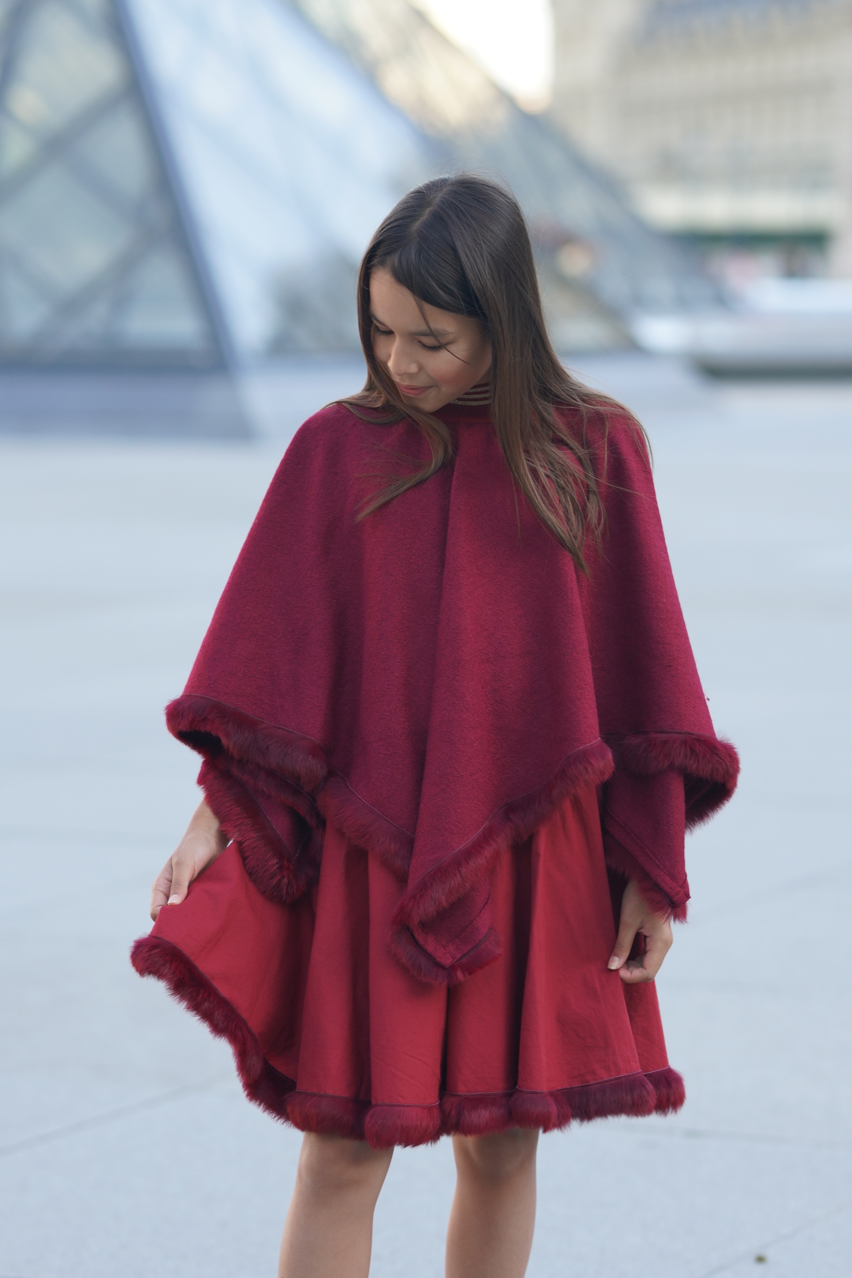 Poncho en laine mélangée bordeaux bordé de fourrure. Col en bord-côte bordeaux et or. Jupe en coton bordeaux et ruban de fourrure. Taille en bord-côte bordeaux et or. Tissus: 60% laine, 40% viscose...
