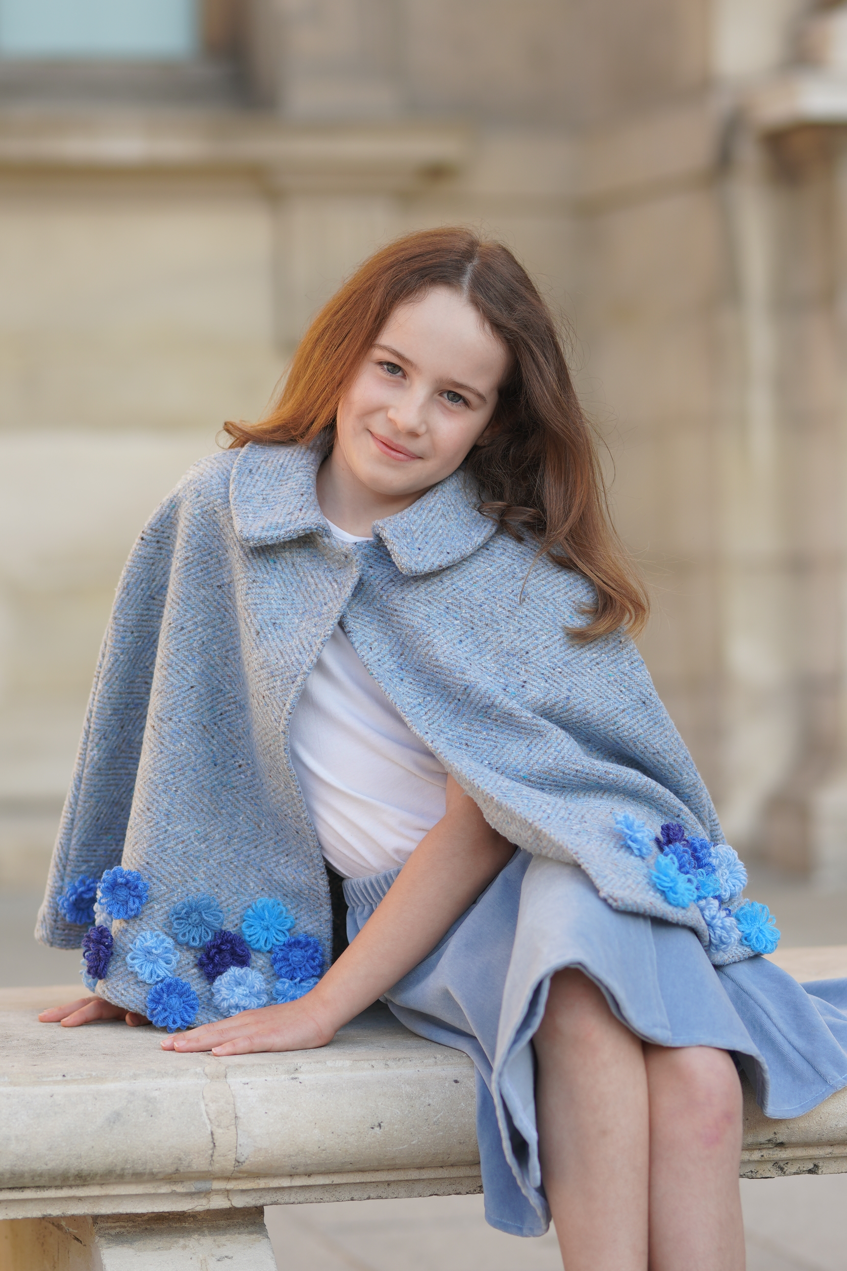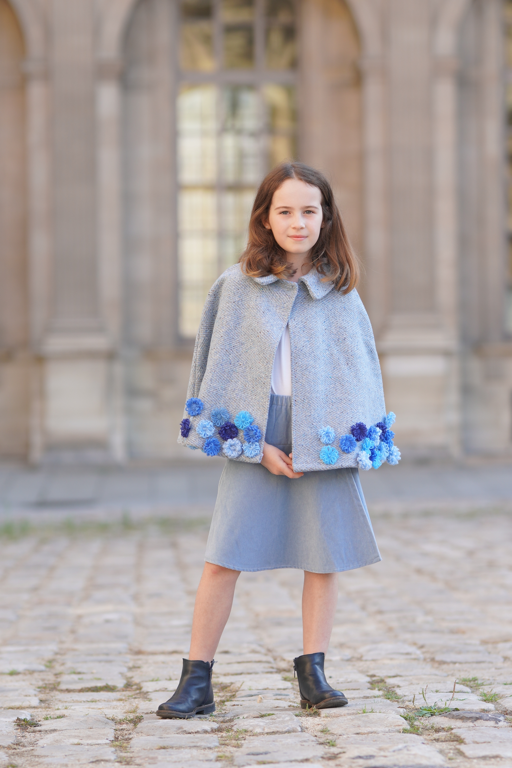 Cape en laine bleu ciel et jupe en velours bleu glacier . Fleurs en laine sur le bas de la cape. Jupe façon portefeuille avec élastique à la taille et brandebourg décoratif. Tissus: laine mélangée,...