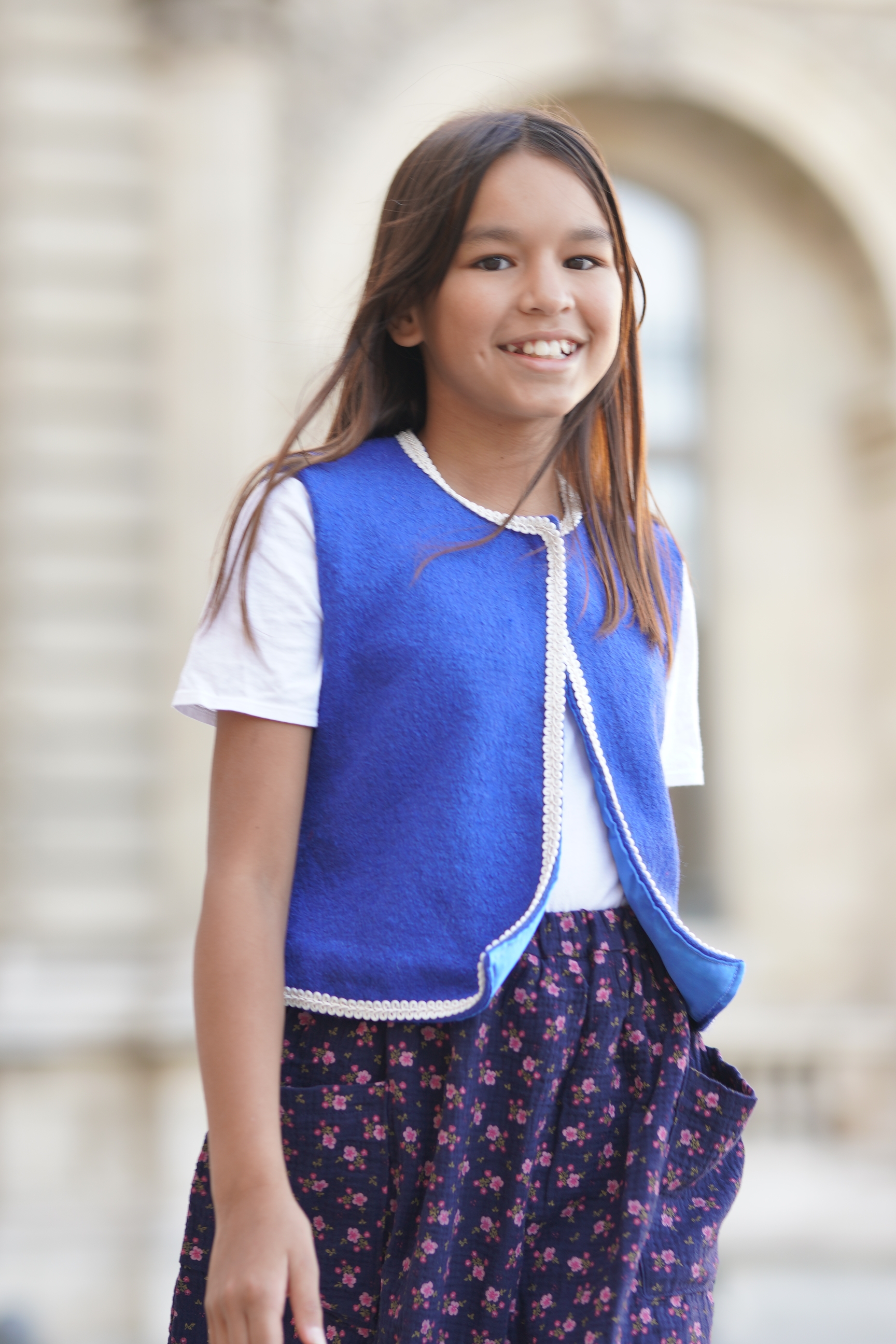 Gilet en laine bouillie bleu cobalt bordé d'une tresse écrue. Jupe en coton double gaze marine à fleurs. Elastique à la taille. Tissus: 60% laine, 40% viscose, doublure 100% polyester; 100% coton....
