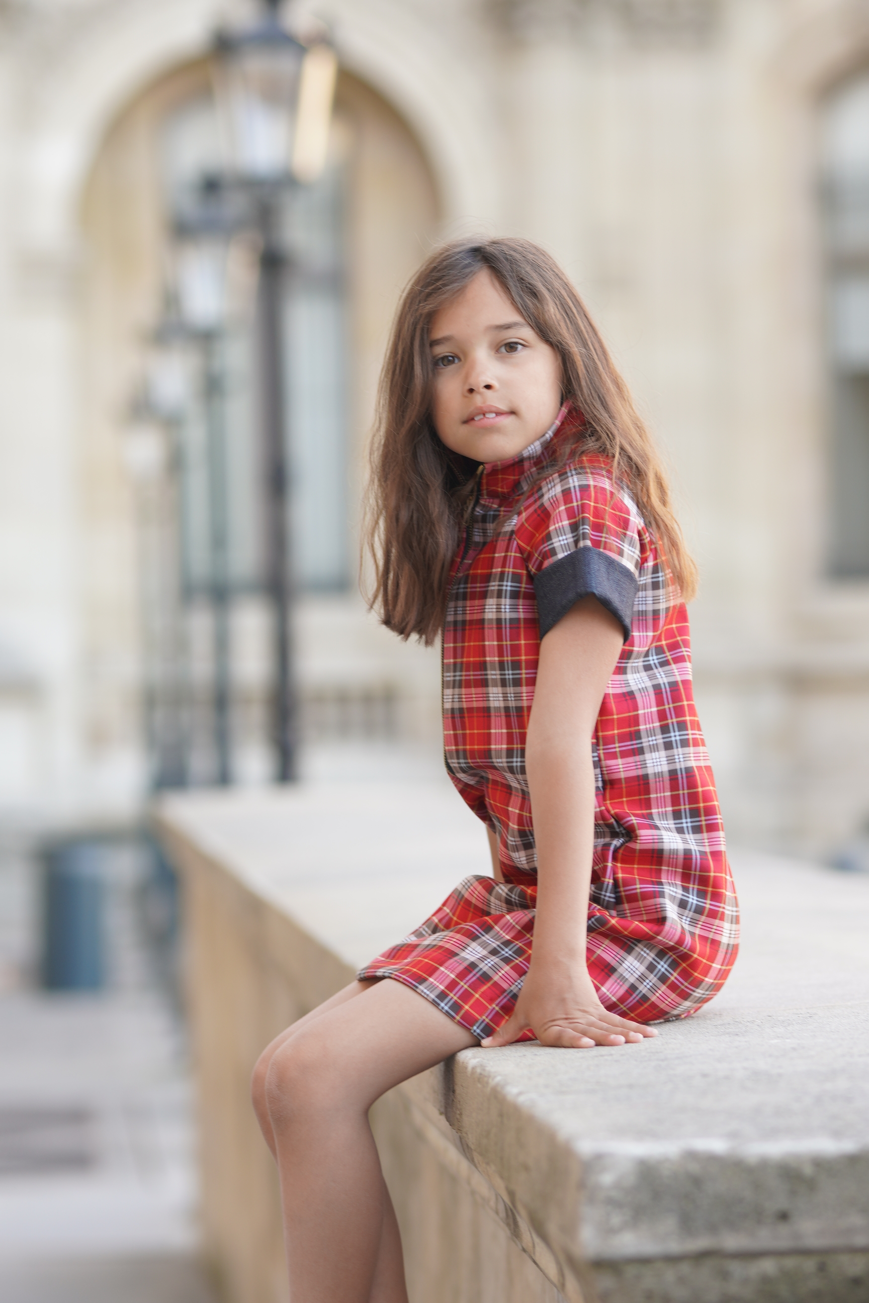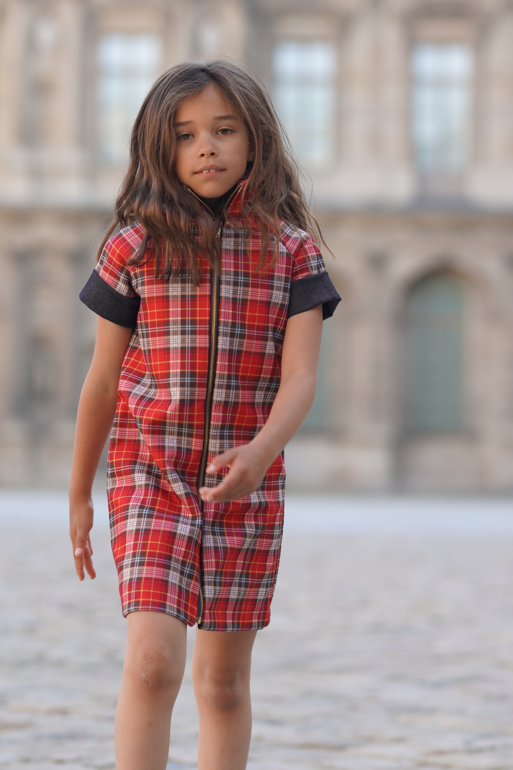 Robe en jean à carreaux rouges. Manches cortes à revers. Col montant. Fermeture à glissière séparable devant Tissus: coton mélangé. Made in France.