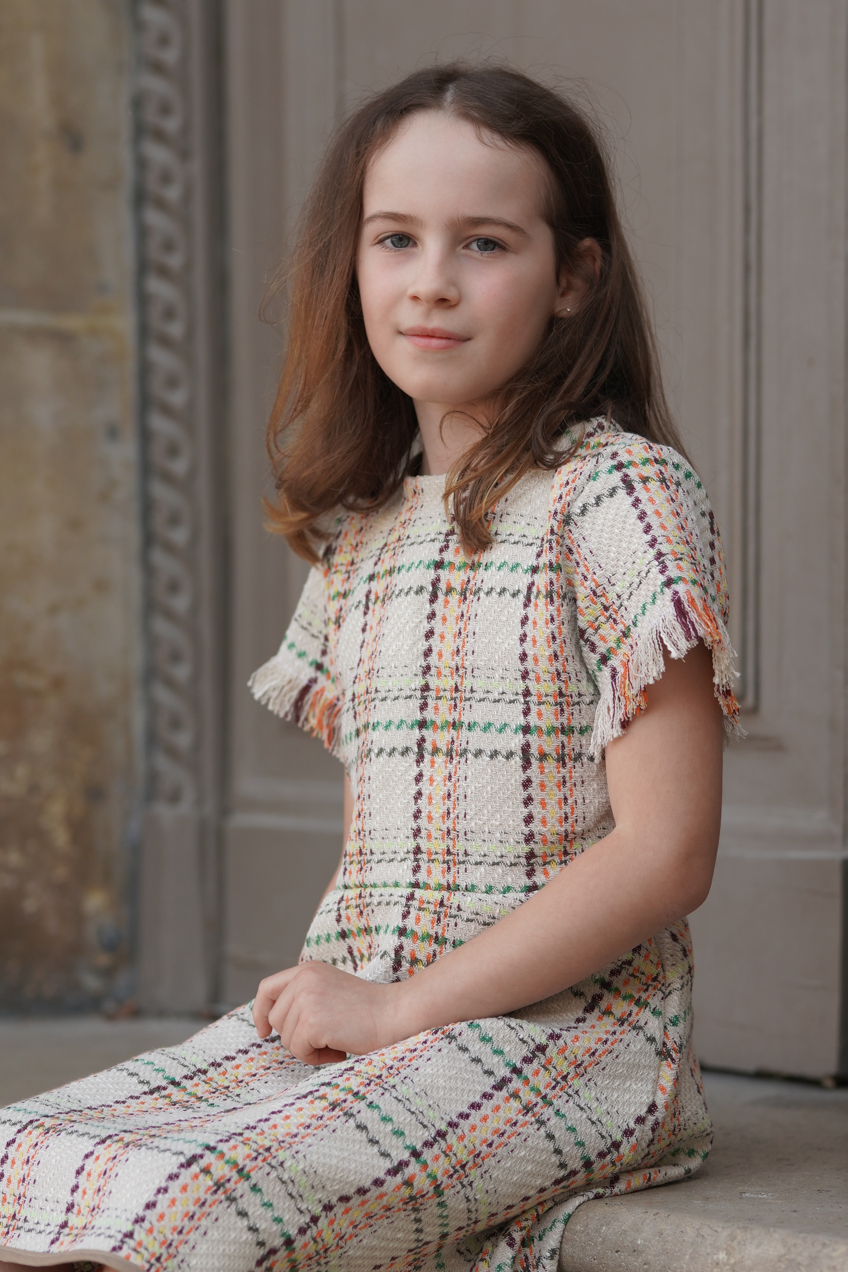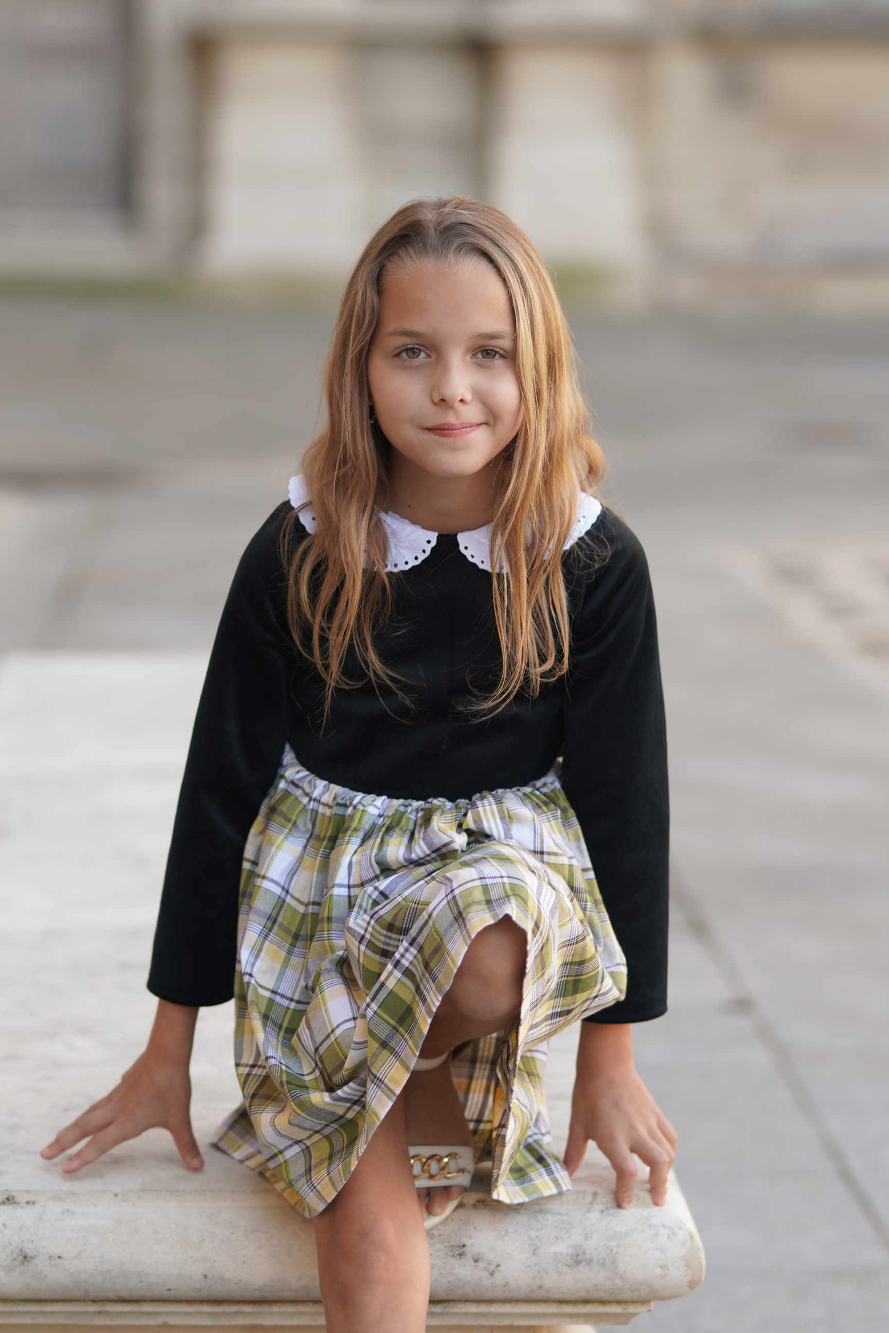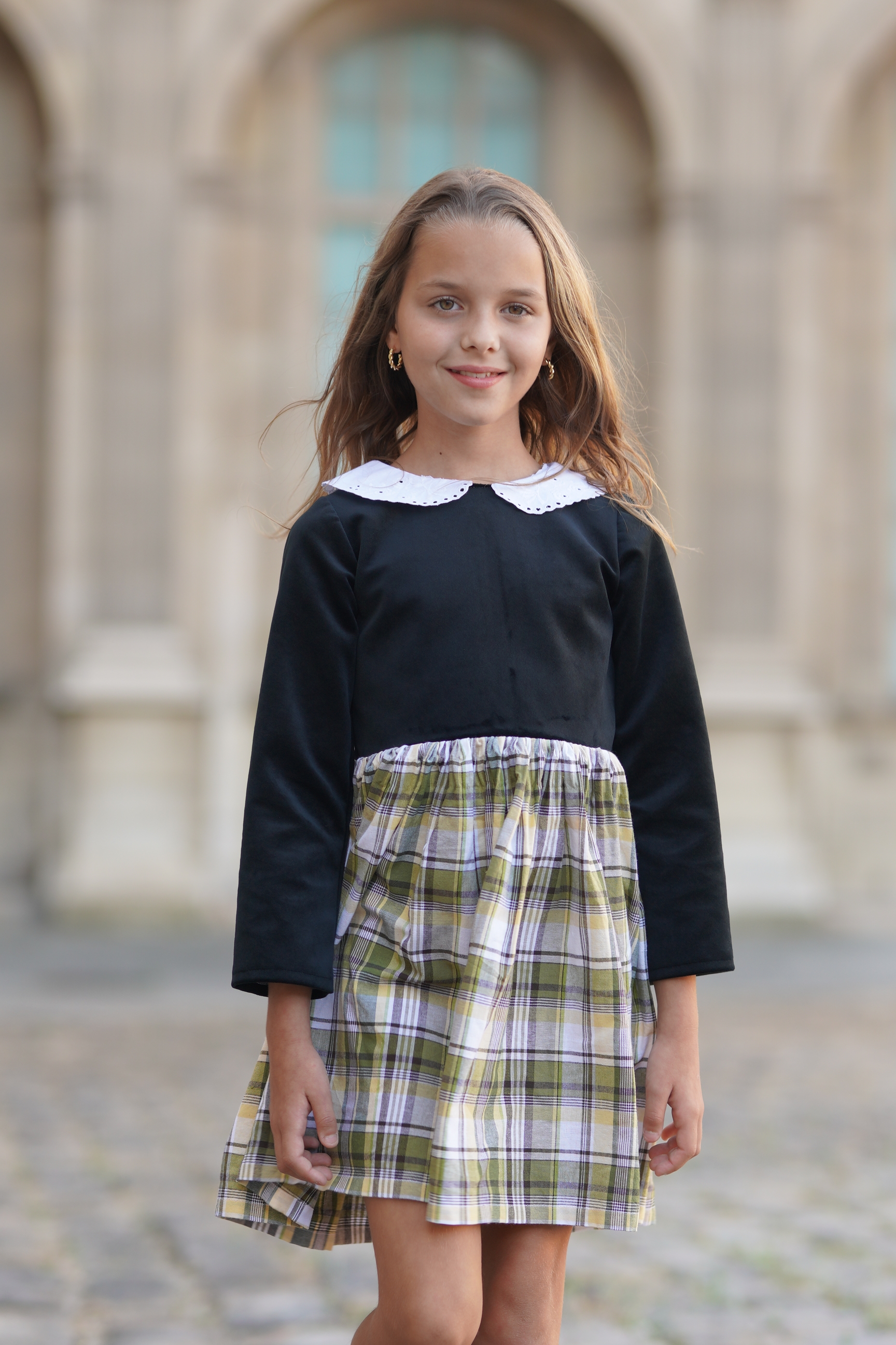 Robe en velours noir et coton à carreaux blanc, jaune et vert. Manches longues. Col en coton brodé blanc. Fermeture à glissière invisible dans le dos. Tissus: 100% coton. Made in France.
