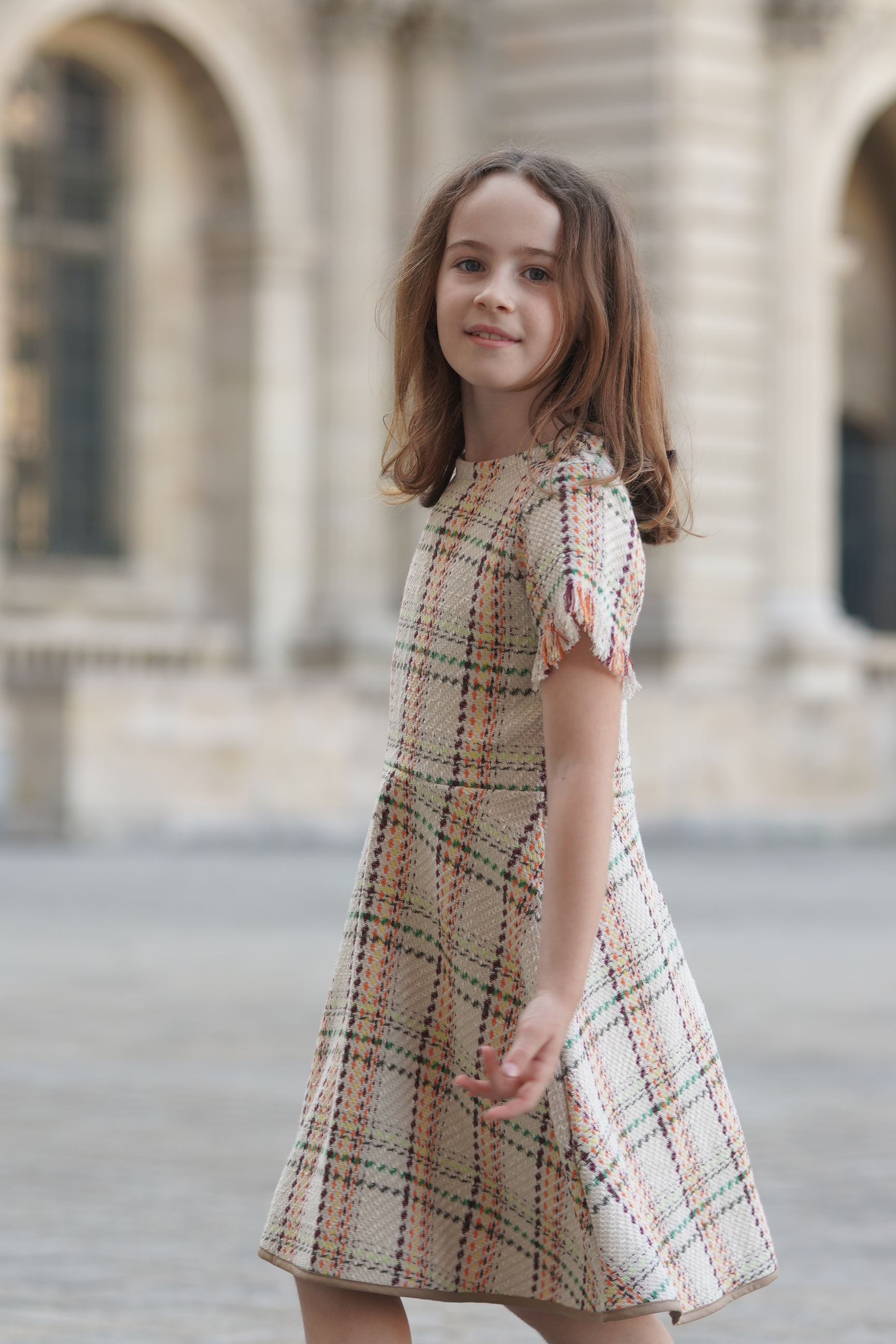 Robe en Tweed beige. Manches courtes. Biais marron au bas de la jupe. Fermeture à glissière invisible dans le dos Tissus: coton mélangé. Made in France.