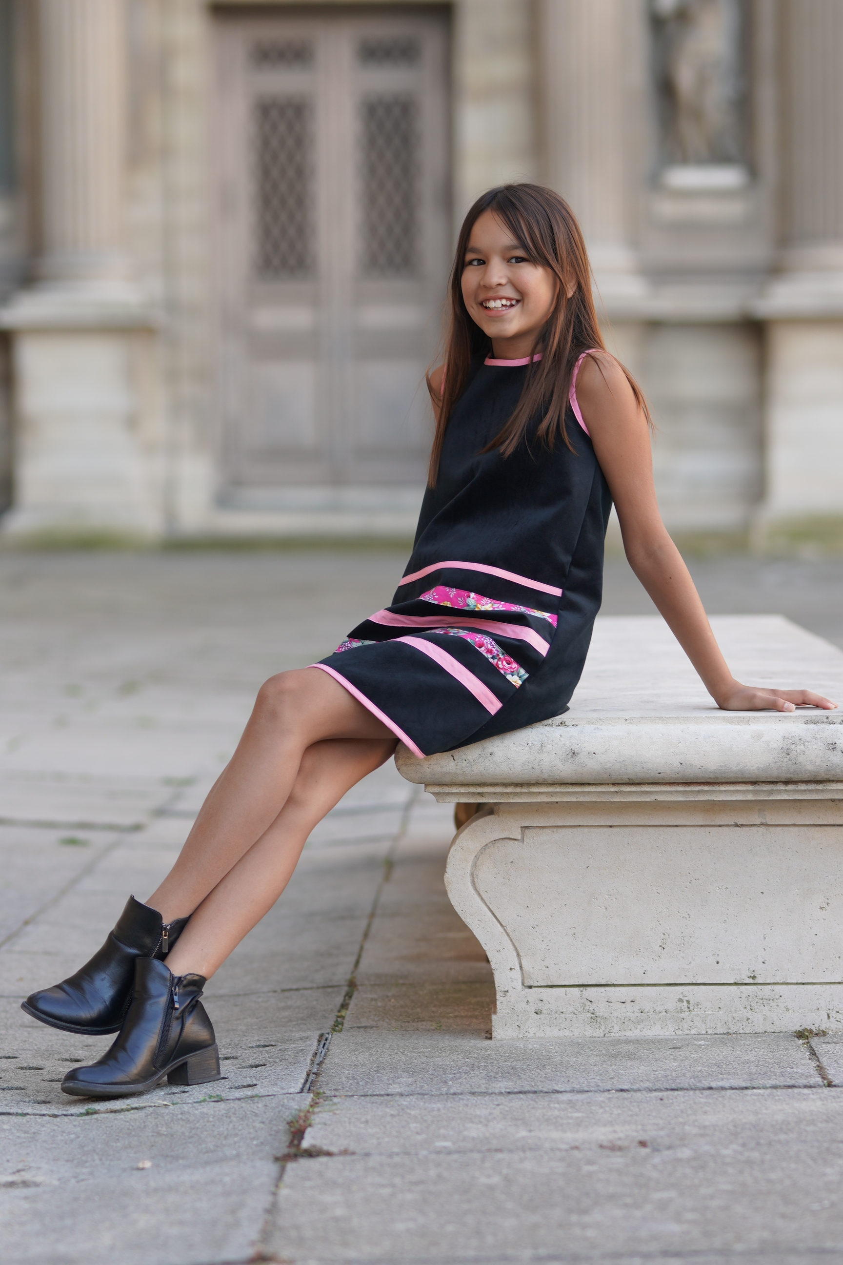 Robe sans manches en velours noir et rubans roses. Biais rose et à fleurs sur le devant Fermeture à glissière invisible dans le dos. Tissus: 100% coton. Made in France.