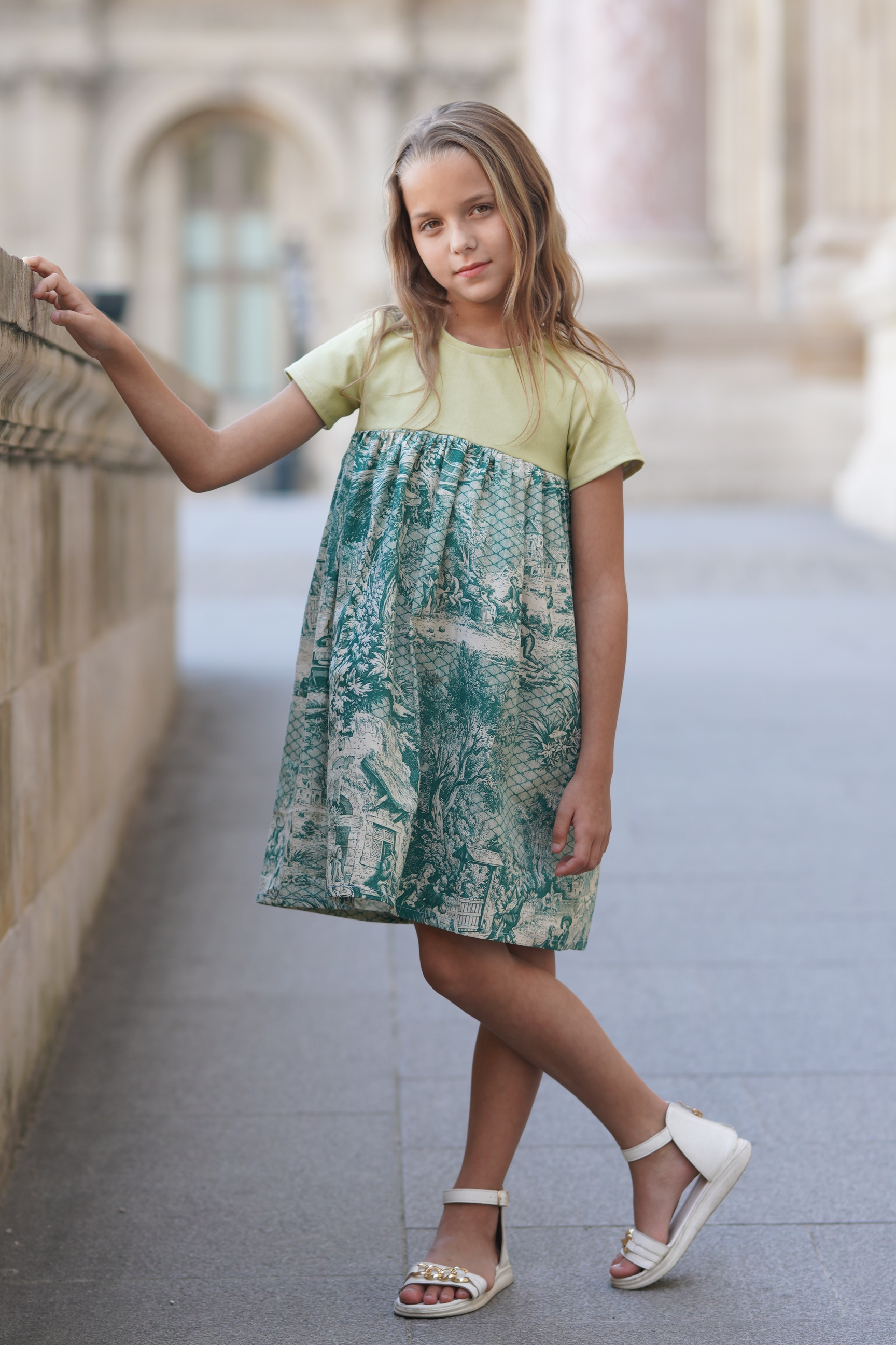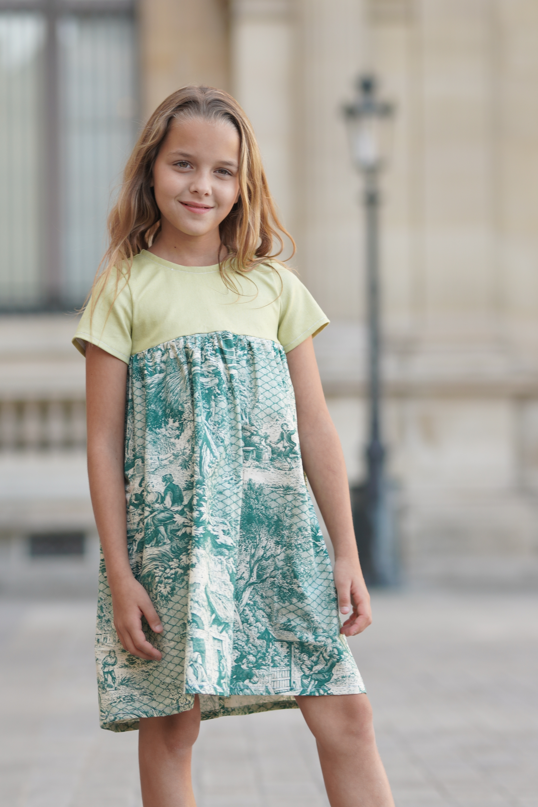 Robe à manches courtes en coton et toile de Jouy vert. Fermeture à glissière invisible dans le dos. Tissus: coton mélangé. Made in France.