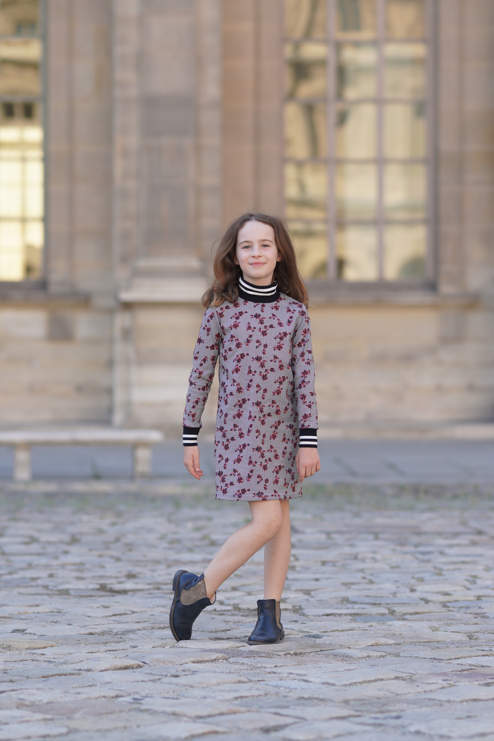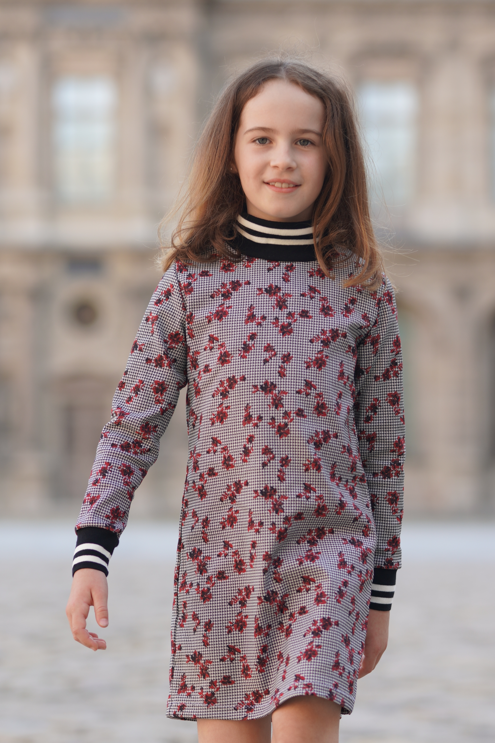 Robe pied-de-poule blanc et noir à fleurs rouges. Manches longues. Bord-côte noir et blanc à l'encolure et aux bas des manches Tissus: coton mélangé. Made in France.
