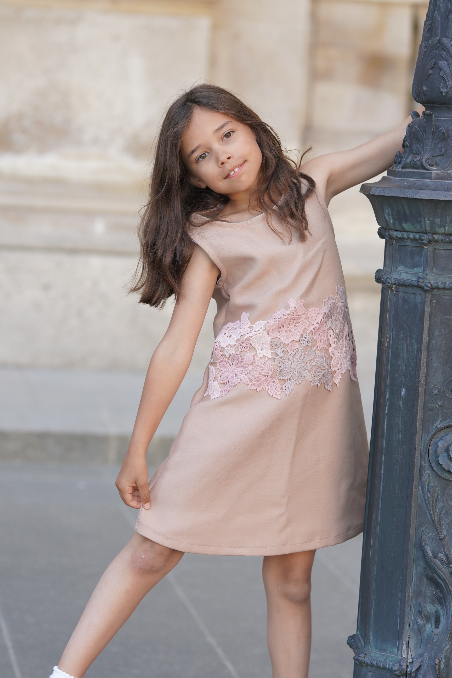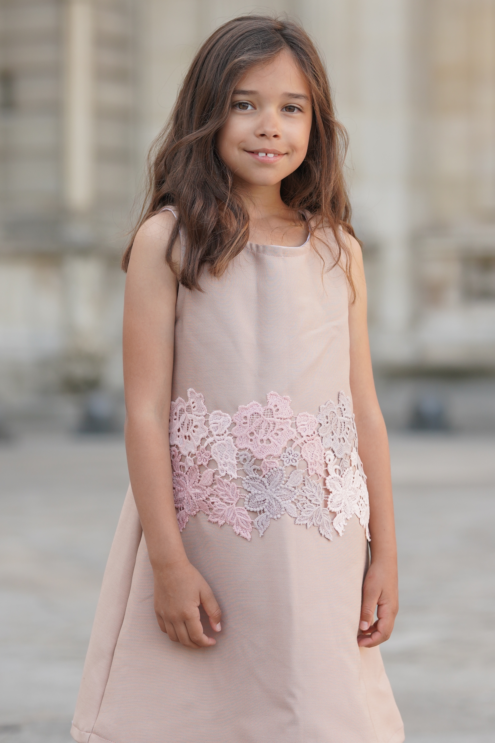 Robe sans manches en laine et soie beige rosé. Bande de dentelle à la taille. Fermeture à glissière invisible dans le dos. Tissus: laine et soie. Made in France.